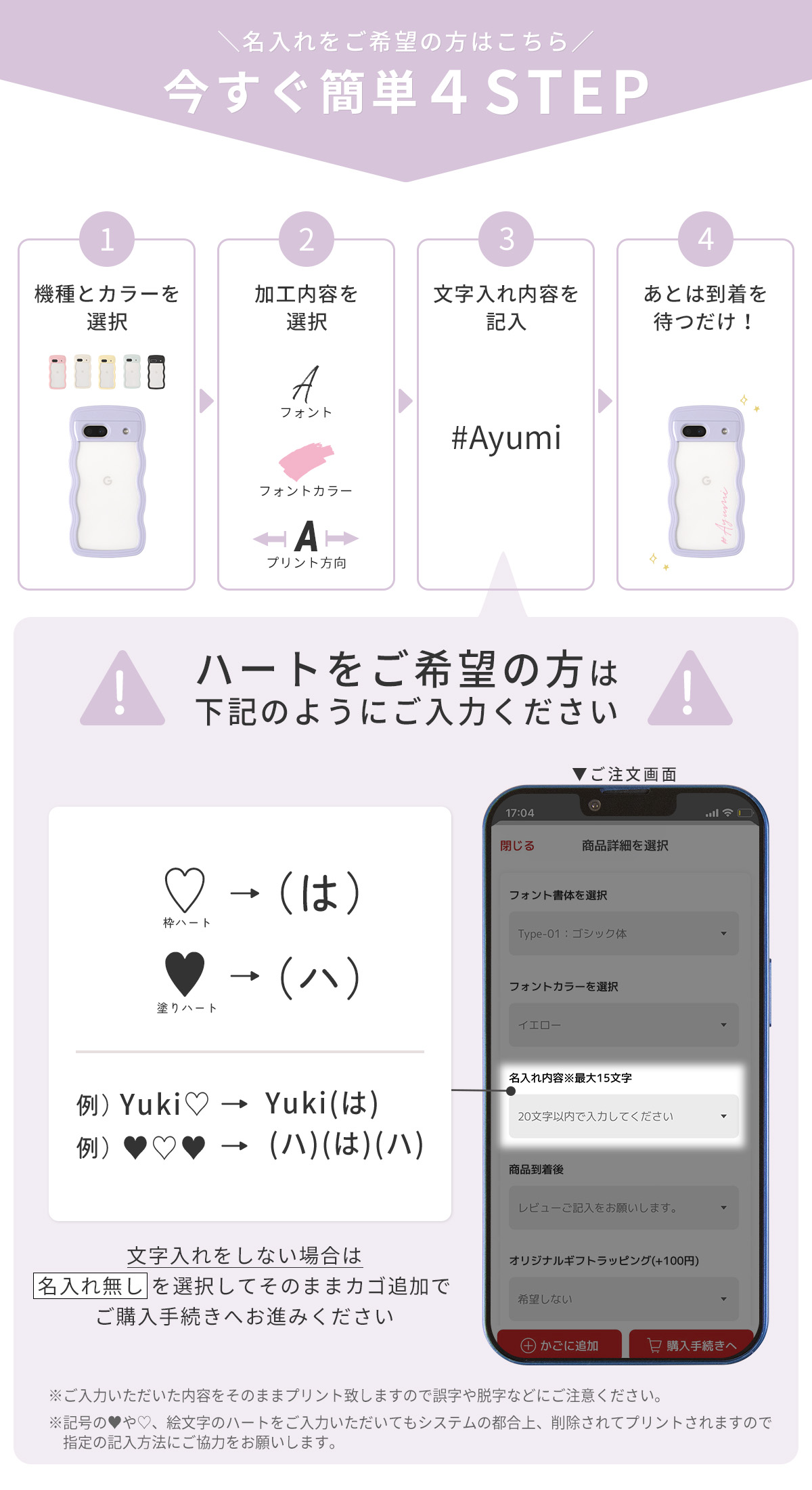 「文字入れあり」はトレンドのケースに、まわりとは一味違う特別感をプラスできます。